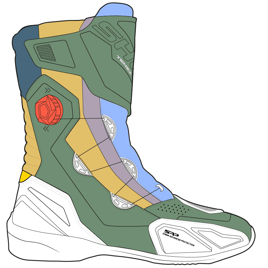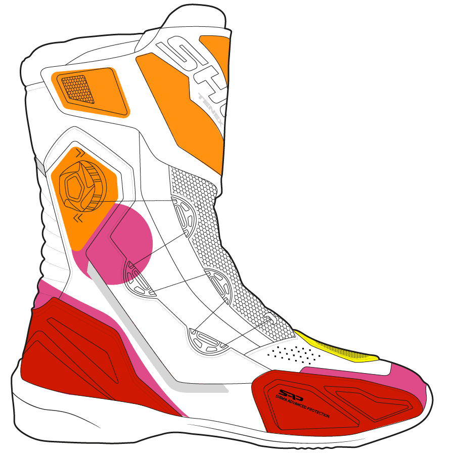 Wystarczy jeden ruch, żeby poczuć różnicę: boczny system ATOP pozwala w ciągu sekund zapiąć całego buta, zapewniając stabilność i dopasowanie stopy oraz kostki. Specjalna podeszwa ESG jest wzmocniona konstrukcją polipropylenową zapewnia doskonałą stabliność i czucie motocykla dzięki zróżnicowanemu bieżnikowi na obszarze zmiany biegów, podnóżka oraz pięty.